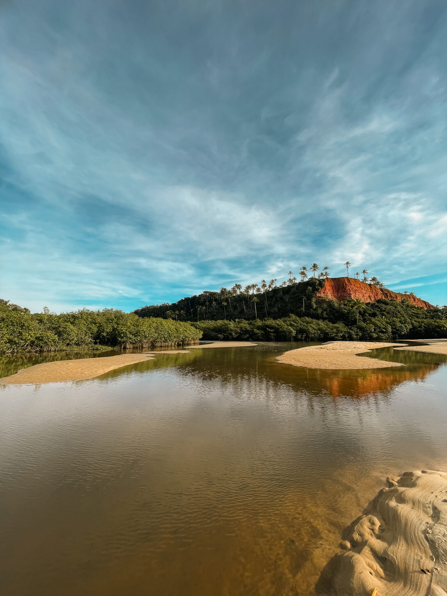 A foz do Rio da Barra, onde o rio encontra o mar, cria piscinas naturais de águas esverdeadas, perfeitas para um banho relaxante. O cenário é complementado pelas falésias de tons suaves, coqueirais e um rico manguezal que emoldura a região.
