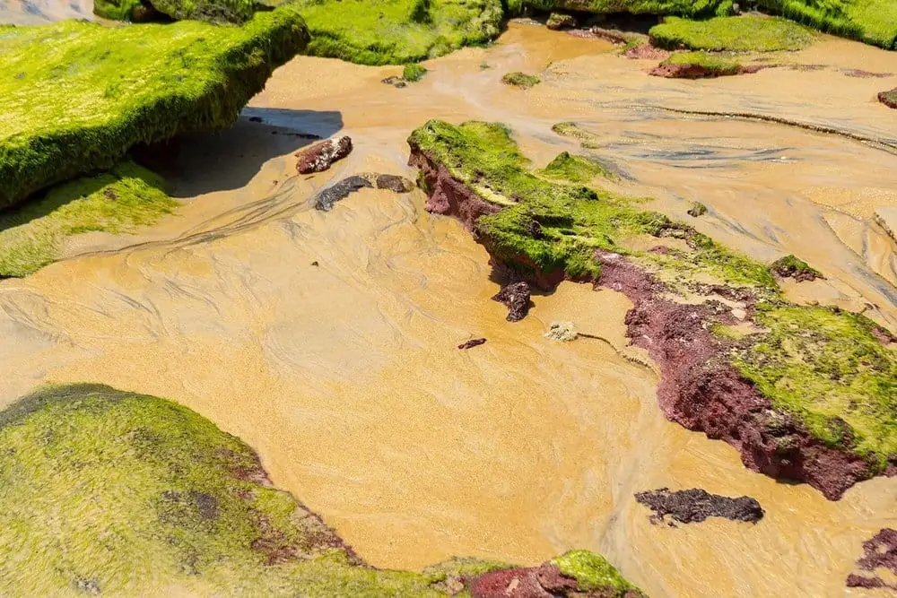 As formações de corais vão do cinza vulcânico a incríveis tons rosados e, junto com o verde do musgo que cobrem algumas delas, dão um lindo contraste não só com as águas (dependendo da luz do sol, em vários tons de azul) como também com as areias branca e preta, e seus muitos desenhos. Há trechos da praia em que essa areia preta formada por compostos orgânicos da vegetação que dá o tom também das águas escuras das lagoas sobrepõem completamente a areia tradicional. E basta cavar um pouco para descobrir a areia clara por baixo dela.