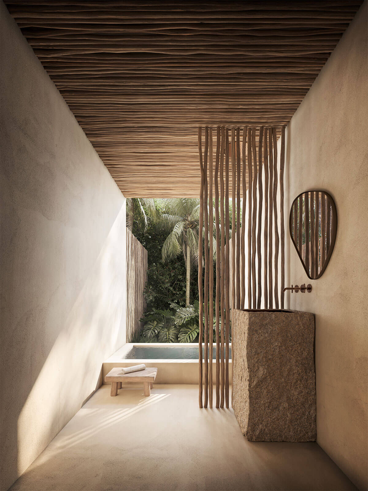 O projeto celebra os talentosos carpinteiros e artesãos da região, reconhecida por seus artistas manuais, ao incorporar madeira combinada com cimento micropigmentado. Essa composição materializa elementos da arquitetura brasileira em sintonia com o estilo de vida de Trancoso, promovendo uma estadia mais contemplativa, que desperta o sentimento de pertencimento.
