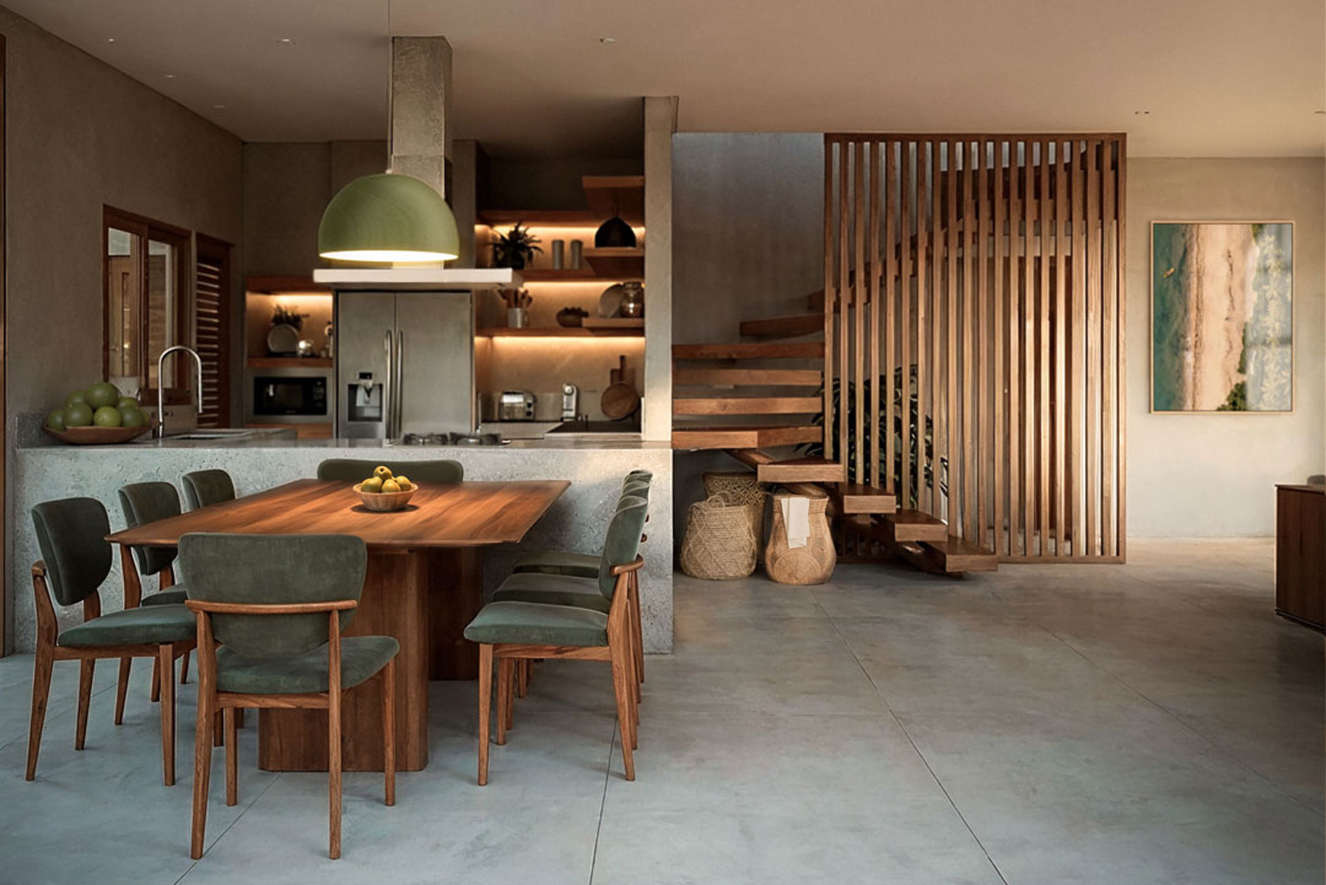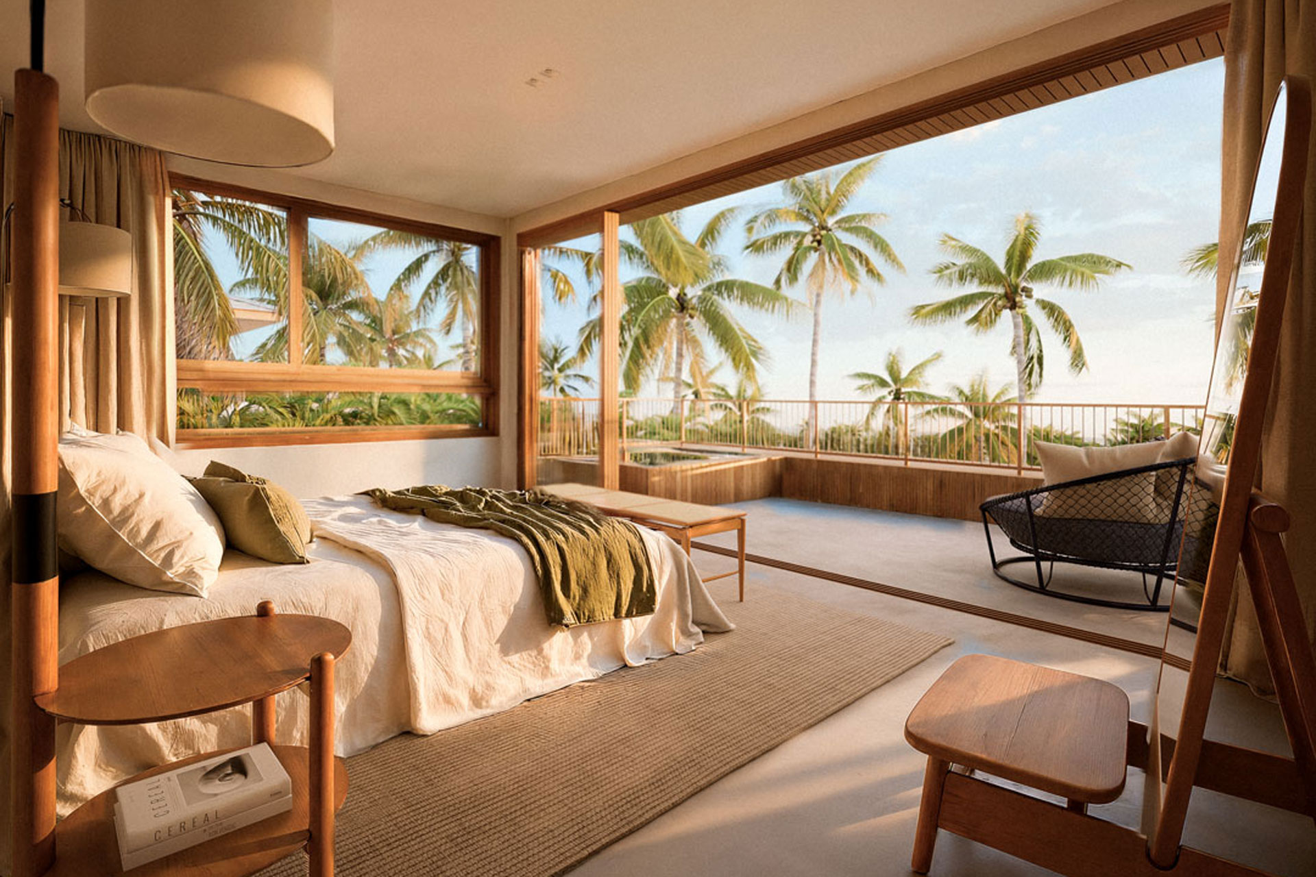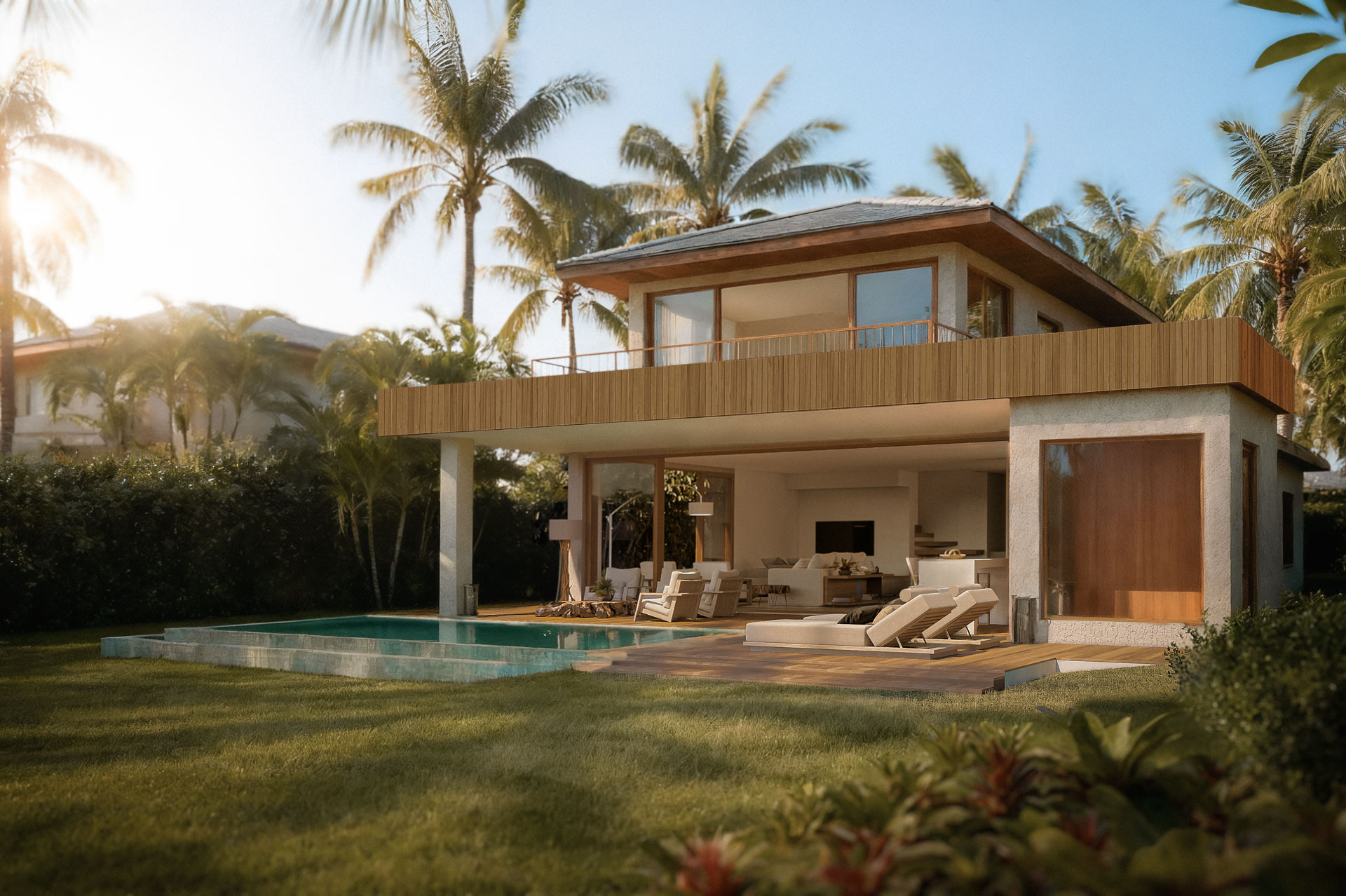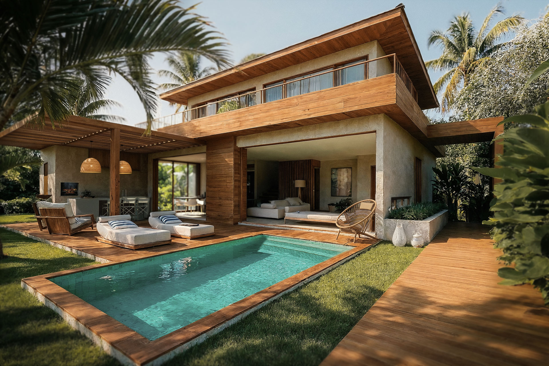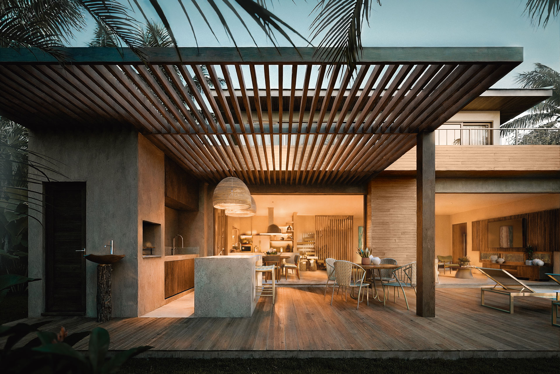 Este diálogo harmonioso entre arquitetura e paisagem inspira um profundo pertencimento ao sul da Bahia. Cada detalhe, com a madeira assumindo o protagonismo nos acabamentos e elementos de design, reforça a essência natural e acolhedora que permeia cada residência.