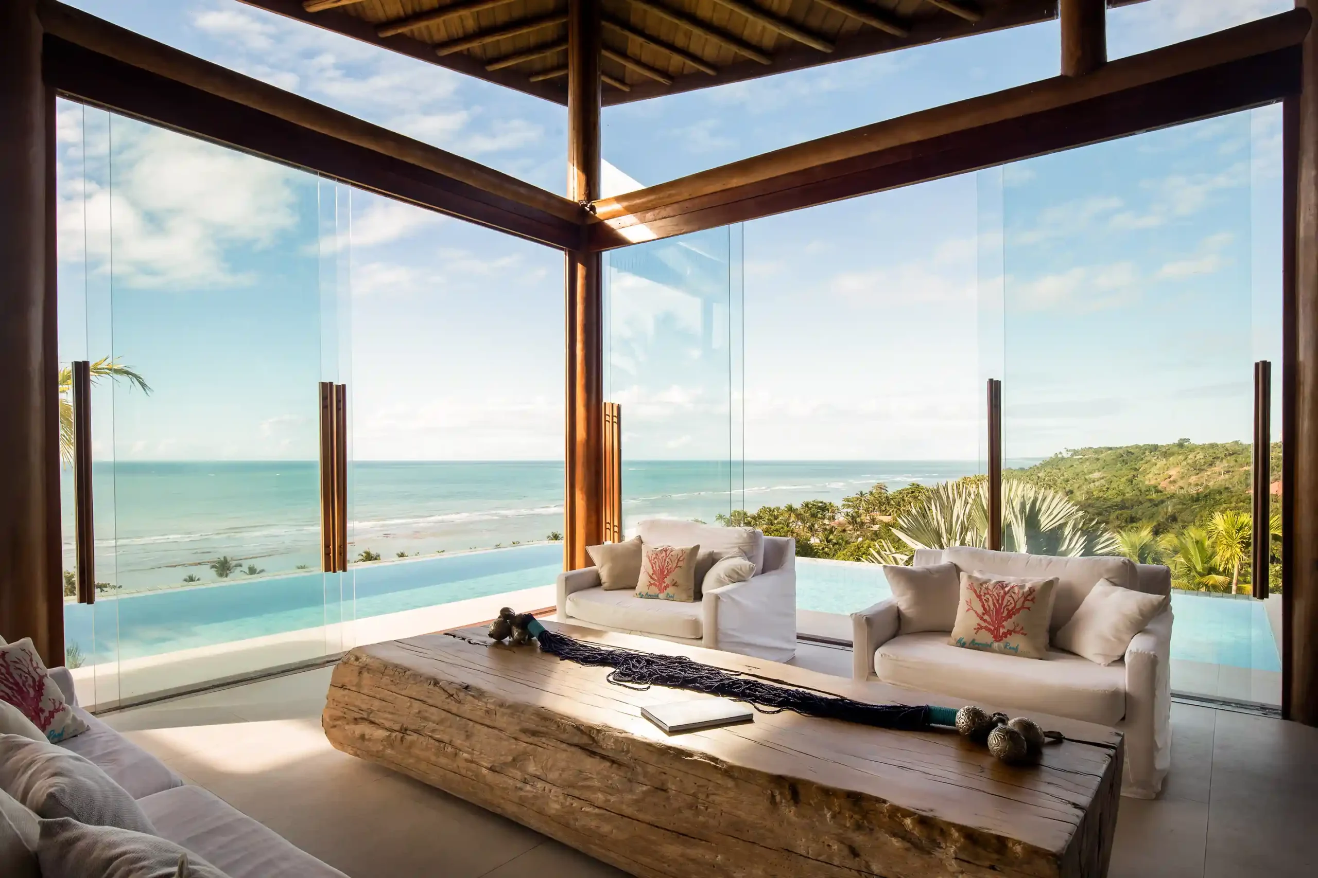 O azul infinito do mar invade a vista 180º que nos parece fazer flutuar na imensidão, enquanto o verde da mata nos recorda que estamos com os pés fincados no chão. O telhado aponta para o horizonte em um terreno de 5.800 m², com 800 deles de área construída. Seis suítes, varandas e área social com espaço gourmet, deck de madeira com piscina de borda infinita e spa. Além de acesso exclusivo à praia por uma escada interna.