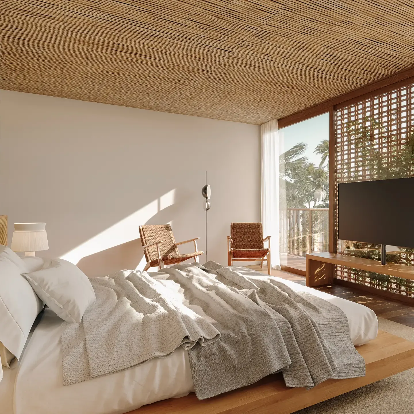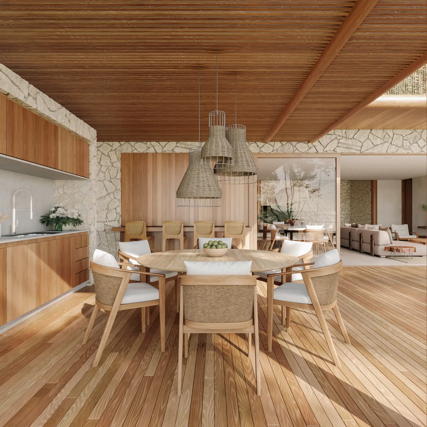 Este diálogo harmonioso entre arquitetura e paisagem inspira um profundo pertencimento ao sul da Bahia. Cada detalhe, com a madeira assumindo o protagonismo nos acabamentos e elementos de design, reforça a essência natural e acolhedora que permeia cada residência.